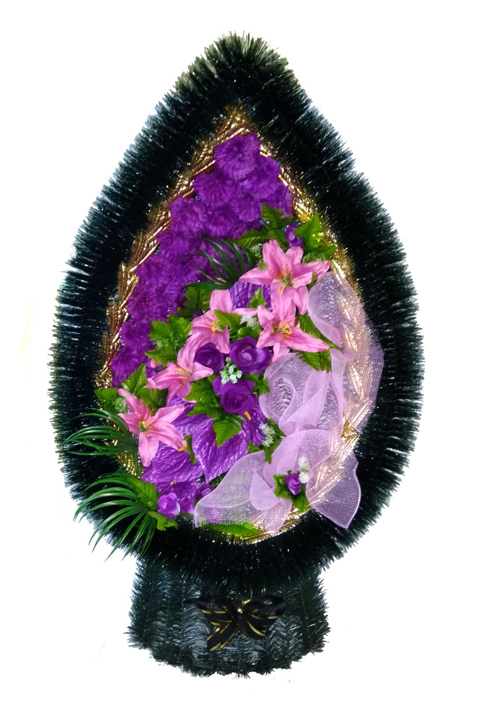 Produsul dat este confecționat din carcas metalic, brad sau pin artificial, flori artificiale, lentă, decor.