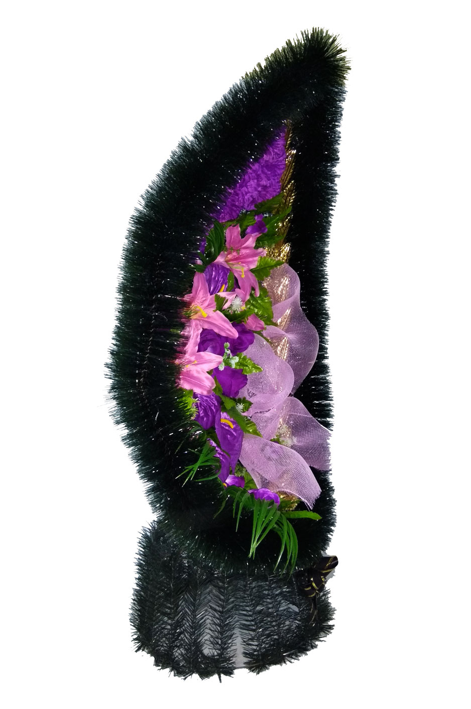 Produsul dat este confecționat din carcas metalic, brad sau pin artificial, flori artificiale, lentă, decor.