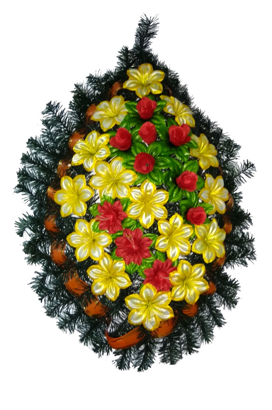 Produsul dat este confecționat din carcas metalic, brad sau pin artificial, flori artificiale, lentă, decor.
