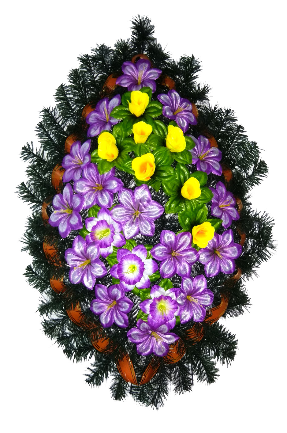 Produsul dat este confecționat din carcas metalic, brad sau pin artificial, flori artificiale, lentă, decor.