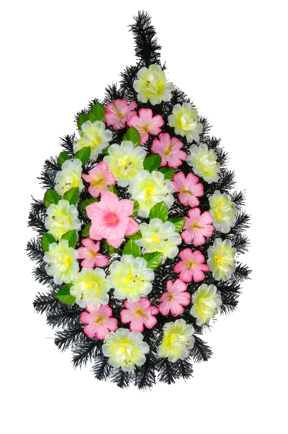 Produsul dat este confecționat din carcas metalic, brad sau pin artificial, flori artificiale, lentă, decor.